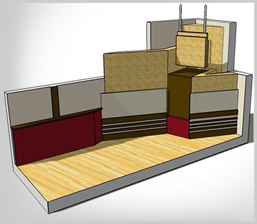 Unser großer Aufnahmeraum zeichnet sich durch eine offene, lebendige Akustik aus. Um einen natürlichen Klang in diesem Raum zu erzeugen, wurden Bass-Traps, Breitbandabsorber, Slot- und Helmholzresonatoren verwendet. Auch verstecken sich hinter den eigens angeordneten Slotresonatoren, speziell abgestimmte Acoustic Hangers, die dem Raum eine kleine Besonderheit verleihen: Eine unterschiedliche Nachhallzeit.